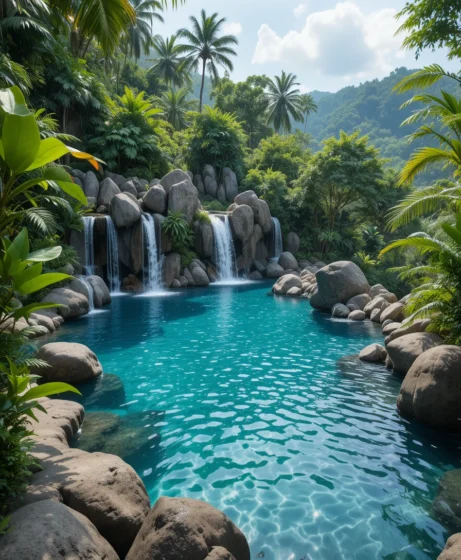 Adding natural rocks around the pool enhances a tropical vibe. I picture cascading water over boulders. It feels like a hidden jungle paradise.