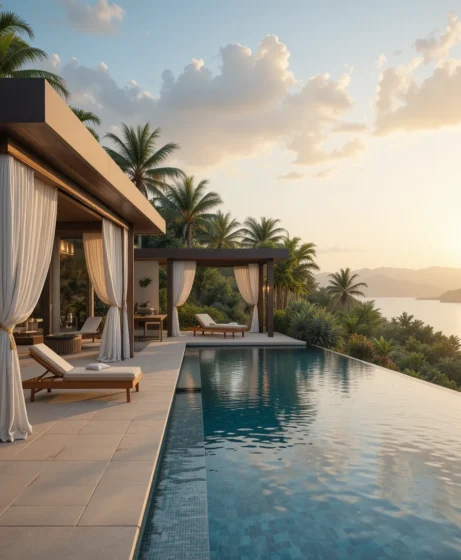 Incorporating a cabana adjacent to the pool adds comfort and functionality. I imagine loungers, soft curtains, and shaded seating. It turns the pool area into a full luxury retreat.