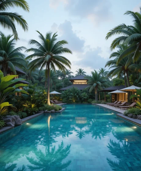Framing the pool with lush palm trees creates a resort-like ambiance. I imagine soft lighting and tropical plants adding to the serene vibe. It feels like a private getaway.