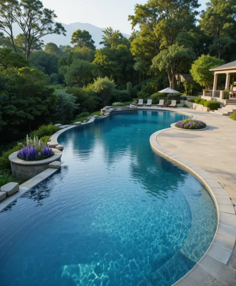 Natural stone decking blends seamlessly with the pool edge. I picture earthy textures and soft greenery. This design feels grounded and organic while maintaining elegance.