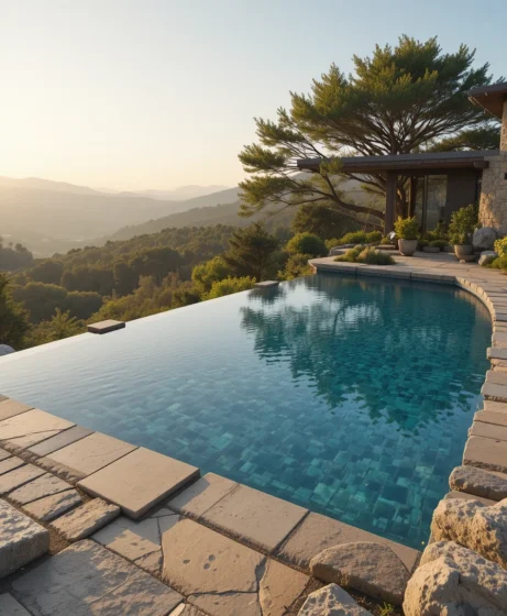 Placing the pool on a hillside enhances the illusion of endless water. I imagine panoramic mountain views. It feels serene, private, and connected to nature.