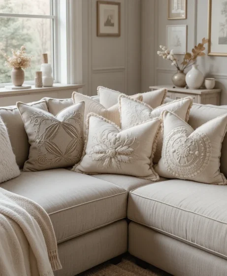 This look uses beige, cream, and light gray tones to create a calm and open living space. Cozy throws and textured pillows add warmth while keeping the overall design clean and modern.