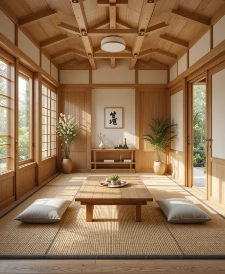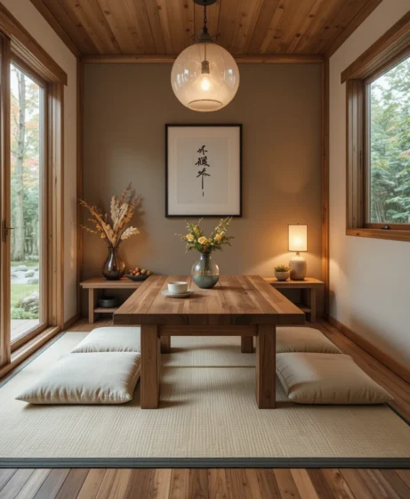 A low wooden table with floor cushions creates an authentic Japanese dining setup. I picture minimal décor and natural materials. It makes mealtime cozy and space-efficient.