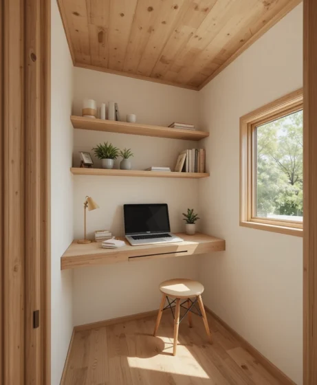 A tiny desk or wall-mounted workspace fits perfectly in corners. I imagine clean lines, shelves above, and natural light from a nearby window. It balances productivity with minimalism.
