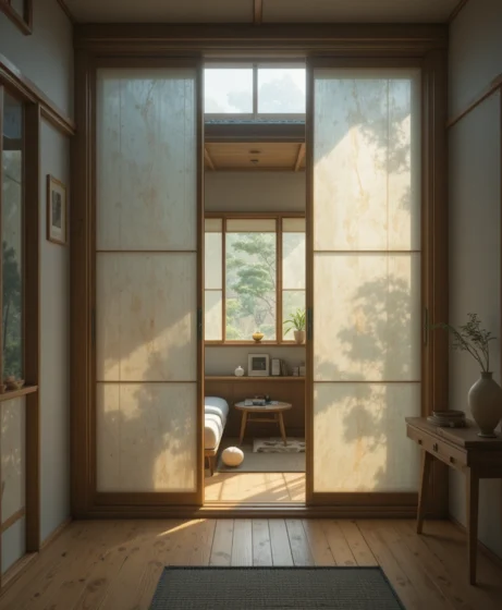 Shoji doors separate areas without closing off light or space. I like how translucent panels soften sunlight while maintaining privacy. They create a calm, airy environment in a compact house.