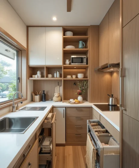 A tiny Japanese kitchen features pull-out drawers and hidden shelves. I picture clean countertops and efficient appliances. Every inch is designed for function without sacrificing style.
