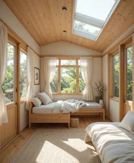 Large windows and skylights bring natural light into the home. I imagine soft wooden frames and simple curtains. Light creates an airy feeling, making the house seem bigger.