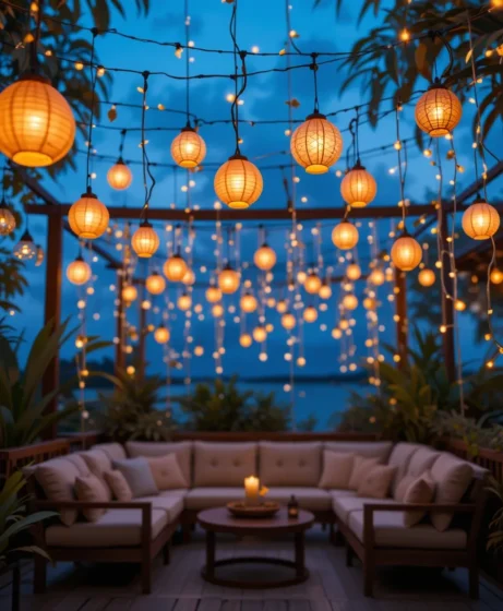 Combine the beauty of lanterns with string lights for a unique touch. The gentle swaying glow adds movement and charm.