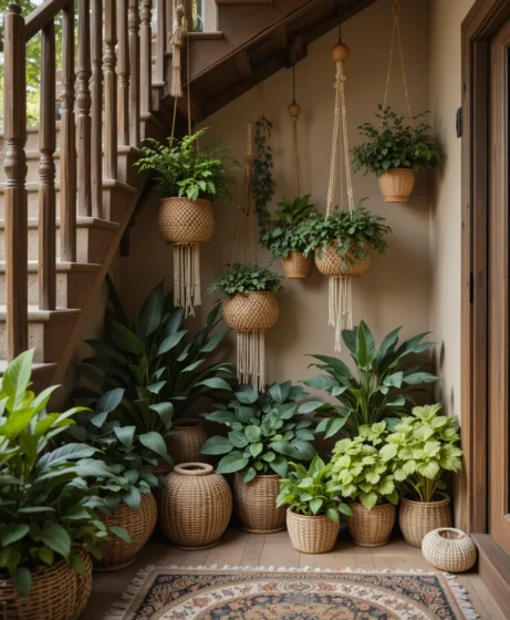 I mix macrame hangers, woven baskets, and greenery for a boho look. It feels relaxed and cozy. This style adds personality to the space.