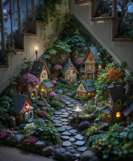 Tiny figurines, mini houses, and soft lighting make the space magical. I enjoy designing this for a playful touch. It’s especially great for family homes.