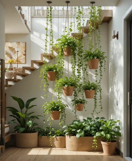 I use hanging pots to save floor space and add vertical interest. Trailing plants like ivy look stunning here. This design feels light and airy.
