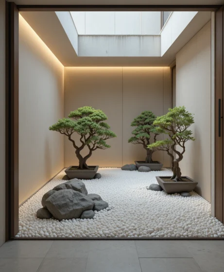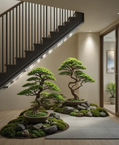 Bonsai trees bring elegance and a sense of calm. I keep the design simple to highlight their beauty. This idea works well in modern or traditional homes.