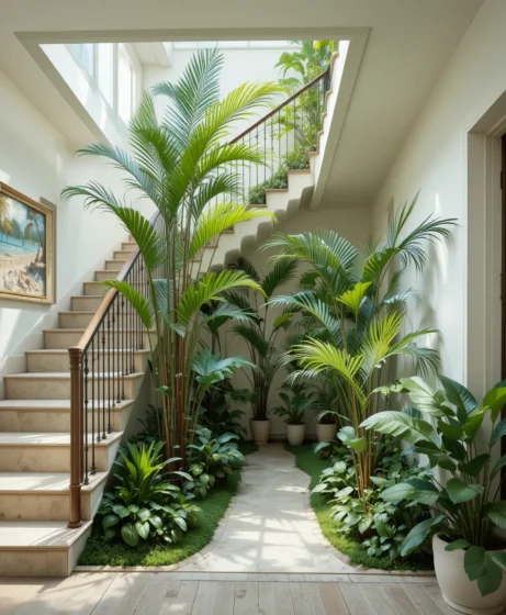 Tall palm plants add height and elegance. I use them to fill vertical space without overcrowding. This idea gives a resort-like feel.