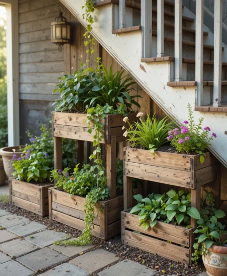 Wooden crates or reclaimed wood planters add warmth and texture. I often combine them with trailing plants. This creates a cozy farmhouse-style garden.