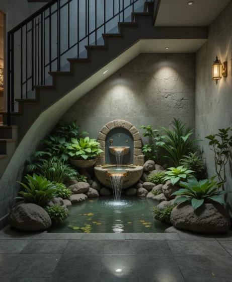 Adding a mini fountain or water bowl with aquatic plants creates a relaxing sound. I find it instantly enhances the mood. It also adds a spa-like feeling under the stairs.