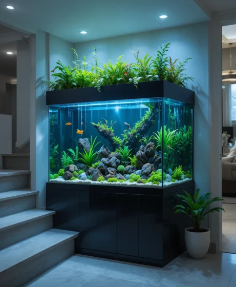 Combining plants with a small aquarium adds life and movement. I find this idea very eye-catching. It creates a calming and unique focal point.