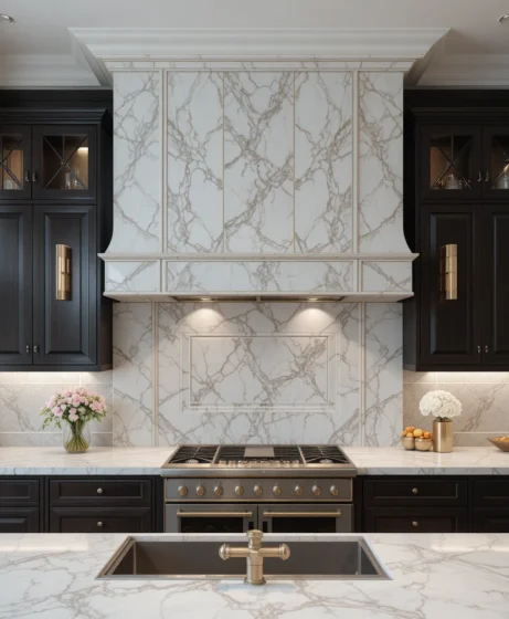 The natural veining in the marble adds artistic detail while maintaining a polished and refined aesthetic. This design works especially well in upscale kitchens with gold or brass fixtures.
