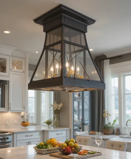 A lantern-style vent hood combines lighting and ventilation into one beautiful structure. Designed to resemble a decorative hanging lantern, the hood often features glass panels and metal frames.
