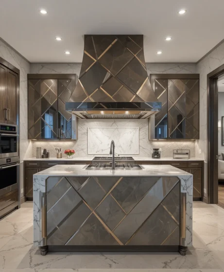 A geometric island vent hood uses bold shapes and angular panels to create a modern design statement. Triangular edges or faceted surfaces reflect light differently from every angle.