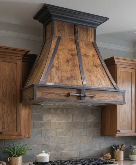 A wood and metal island hood blends natural warmth with industrial strength. Wooden panels frame the hood while metal straps or trim add structure and contrast.