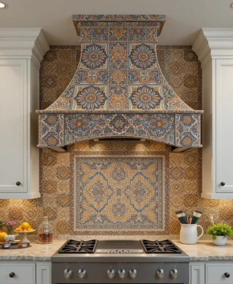 A tile-covered island vent hood introduces color and pattern into the kitchen. Decorative ceramic or handmade tiles wrap around the hood structure, creating a vibrant and artistic surface.