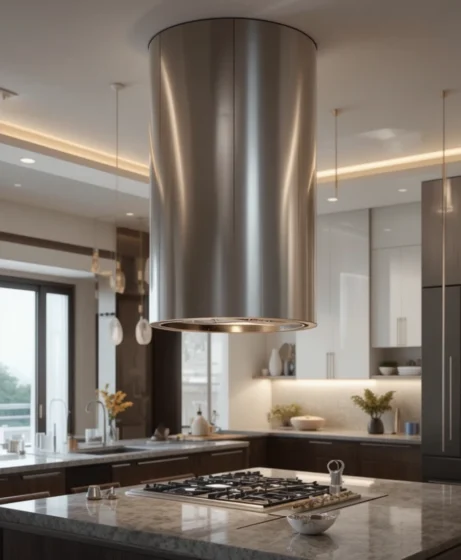 A cylindrical island vent hood introduces a unique and stylish shape to the kitchen. Instead of a traditional rectangular structure, the hood forms a smooth vertical cylinder that hangs directly above the cooktop.