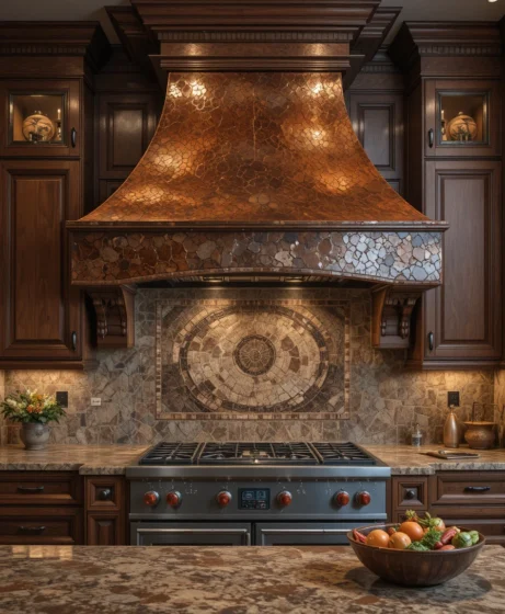 A copper vent hood over an island instantly becomes the centerpiece of the kitchen. The warm reddish tones and hammered textures create a rich and luxurious look.