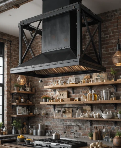The open frame structure allows light to pass through, preventing the island from feeling visually heavy. Combined with brick backsplashes and wooden shelves, the industrial hood creates a striking kitchen centerpiece.
