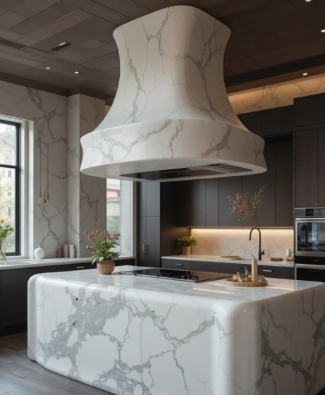 A curved island vent hood introduces soft, flowing lines into the kitchen design. Instead of sharp angles, the hood features a graceful curved silhouette that adds elegance and visual movement.