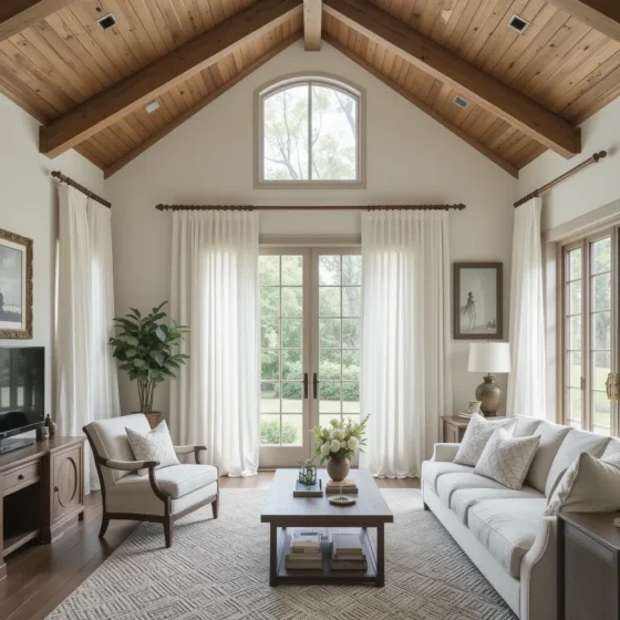 In an open-concept home, use a wooden beam divider to subtly define the living room space while maintaining an airy feel.