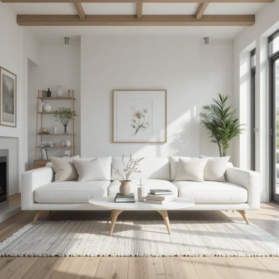 A sleek white sofa with wooden legs blends Scandinavian simplicity with warmth. Pair it with neutral cushions to maintain a clean yet cozy aesthetic.